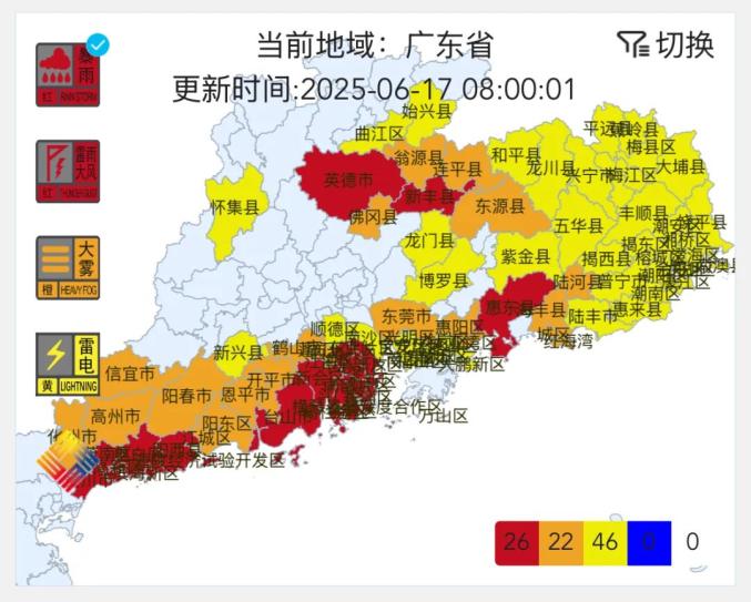 6月17日6时20分,珠海市气象台发布了全市暴雨红色预警信号,全市雷雨大风黄色预警信号继续生效。