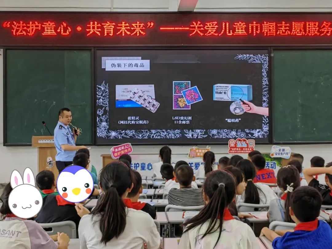 六月是全民禁毒宣传月,毒品危害身体健康,诱发违法犯罪,破坏正常社会经济秩序。针对少年儿童涉毒风险,活动邀请消毒市公安局民警担任禁毒志愿者,使用“模拟样品” 将禁毒教育转移到课堂上的“场景感受”方式。儿童近距离观察装扮成小吃的极具欺骗性的毒品模型,了解身边可能出现的危险。志愿者结合真实案例揭示新毒品危害,提醒学生远离KTV、酒吧等场所,培养健康的生活方式。