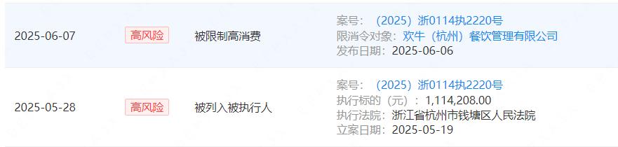 其中,2025年5月,欢牛(杭州)餐饮管理有限公司被列为被执行人,6月份高消费受到限制。随后,网上有传言说质疑声音和品牌倒闭了。