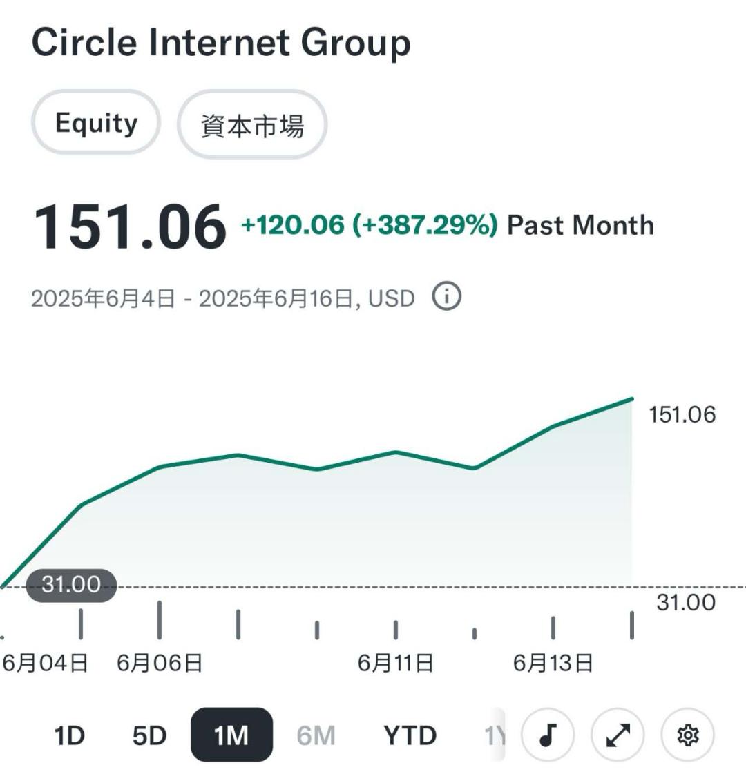 星期一,Circle再次上涨了13.1%,收盘价接近151美元,距IPO发行价31美元扩大了近5倍。现在市值已超过336亿美元。