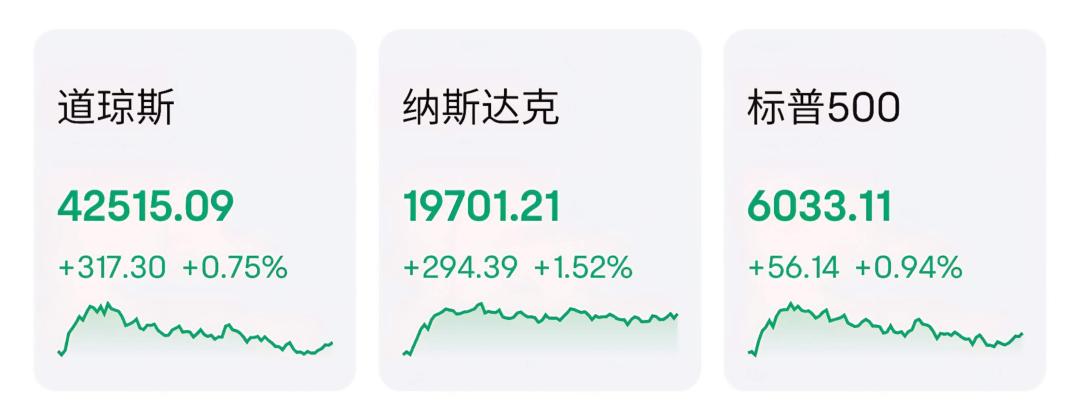 截至收盘,道指涨幅为0.75%;1.52%的纳指上涨;标准普尔500的涨幅为0.94%。