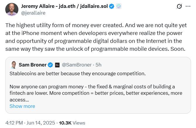 这一轮上涨的催化剂来自杰里米·阿莱尔,CEO。(Jeremy Allaire)上个星期末,X平台(原推特)进行了公开互动。他回应了a16z合伙人Sam 关于稳定货币可编程潜力的Broner评论,并指出:稳定货币的“iPhone时刻”还没有真正到来,但是它正在迅速逼近。