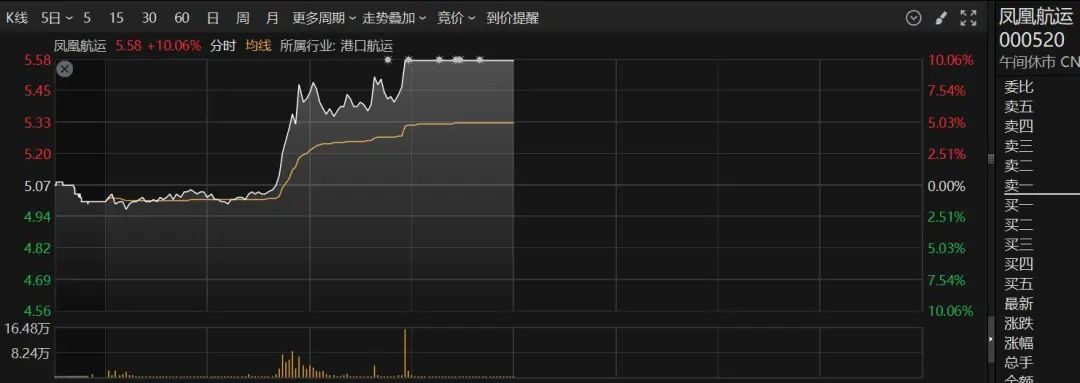 运输服务板块异动拉升,凤凰航运直线拉升日线涨停,国航远洋盘涨幅超过10%,招商南油涨幅超过7%,宁波海运、中远海能涨幅居前。