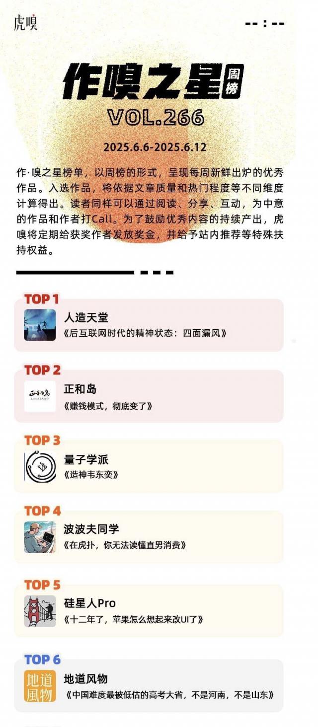 作 · 嗅新星榜,以周榜的形式,呈现每周新发布的经典作品。2025 年 6 月 6 日~2025 年 6 月 12 日,虎嗅第 266 期,作 · 嗅觉之星的获奖文章分别是: