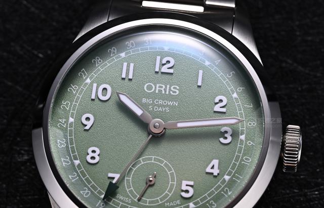 除了盘面布局,豪利时还提供了两种亲和力强、年代感强的表盘颜色,即西瓜红和草绿。虽然这两种颜色看起来没有红色屁股表盘那么鲜艳,但是它们优秀的磨砂线条和微水泥差不多,让整个表面都有远超其价格的质感。此外,它的镶嵌夜光数字时标给了表盘极好的层次感!最后,它的日历指针的尖端配色并不是简单的直接选择鲜红色,而是针对不同的表盘颜色,特别选择了最适合它的互补色。这说明了豪利时的极致用心,因为在豪利时眼里,用心的程度总是比价格高低更重要!