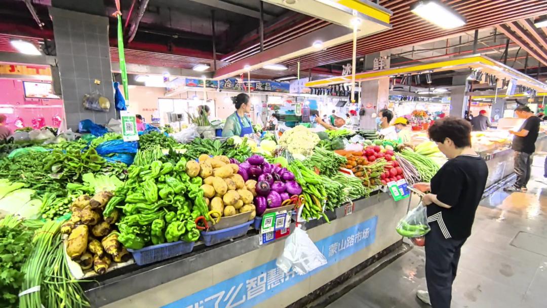 蒙山路市场上,每一个摊位都摆满了新鲜蔬菜、小青菜、苋菜、竹笋、毛豆等各种新鲜蔬菜。