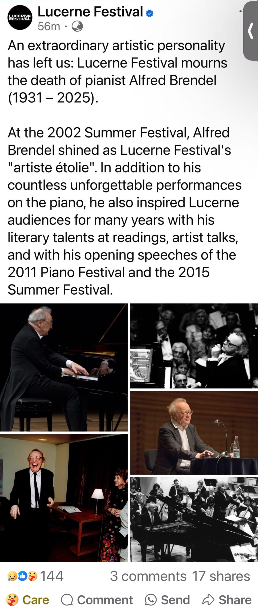 6月17日,奥地利钢琴家阿尔弗雷德·布伦德尔在伦敦家中去世,享年94岁。许多音乐家,如琉森音乐节和威格莫尔音乐厅,都在社交媒体上哀悼大师。