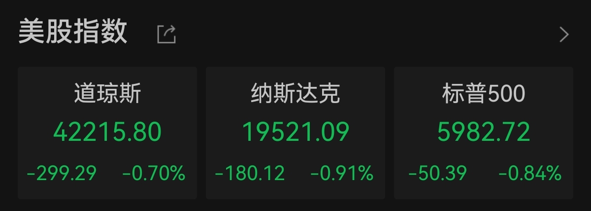 美股三大指数周二集体下跌。道琼斯工业指数收盘时下跌0.70%,报42215.80点;纳斯达克指数下跌0.91%,报19521.09点;标准普尔500指数下跌0.84%,报5982.72点。