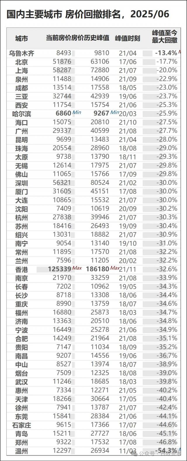 换句话说,如果你碰巧购买了历史高点(高点),上述数据基本上可以反映各大城市房价的下跌。