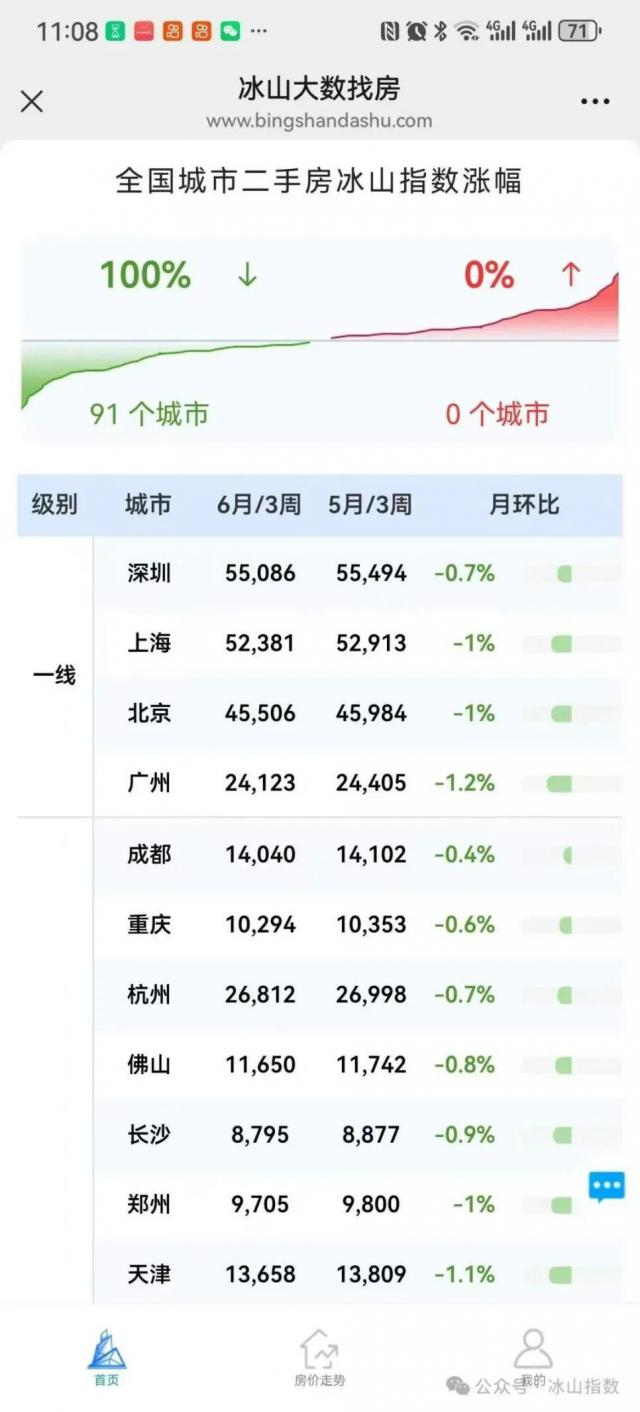首先看下表,这是全国主要城市二手房价格冰山指数的最新指数: