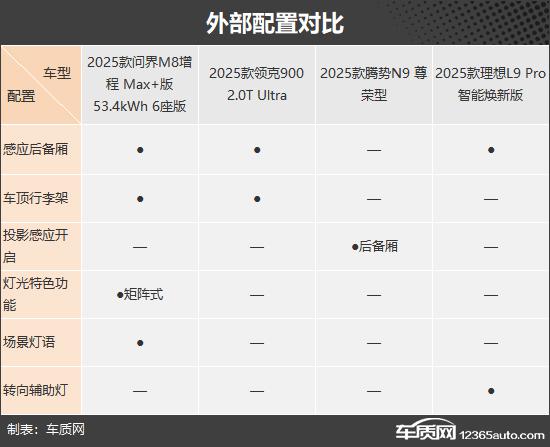 外部配置,问界 M8 四款车中性能相对较好,独享情景灯语和矩阵大灯,科技感更强,夜间照明效果更好。相比之下,腾势 N9 这个环节略逊一筹。