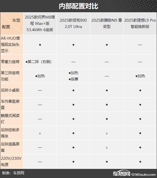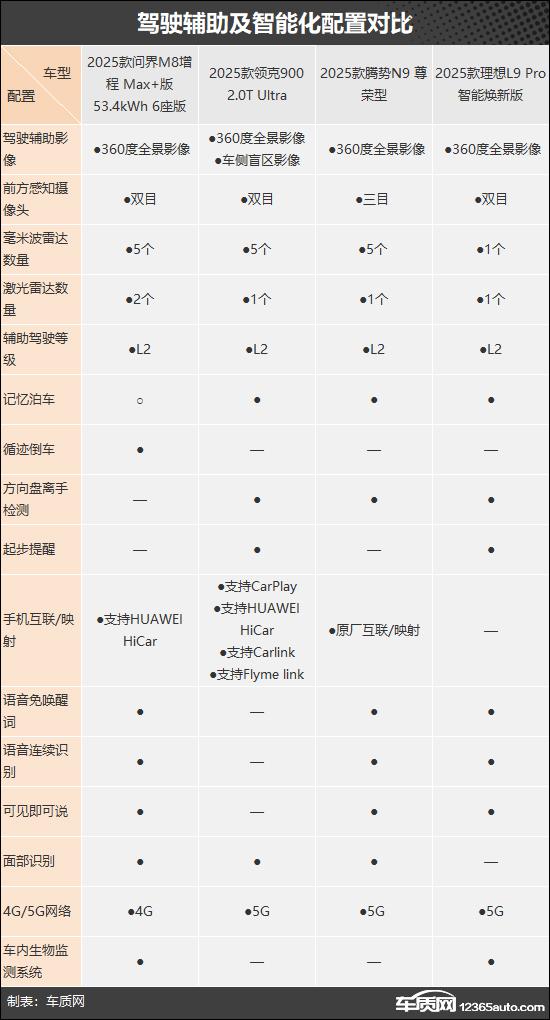 这次选择的四款车分别是 2025 款问界 M8 增程 Max 版 53.4kWh 6 座位(以下简称:问界 M8)、2025 款领克 900 2.0T Ultra(以下简称:领克 900)、2025 款腾势 N9 高贵型(以下简称:腾势型 N9)和 2025 款理想 L9 Pro 智能化焕新版(以下简称:理想 L9)。以上四款车厂商的指导价格比较接近,并且定位为同一个目标市场。以上四款车厂商的指导价相对接近,定位为同一个目标市场。(由于现在照片数量少,有些车型的照片不是相应的具体款式)