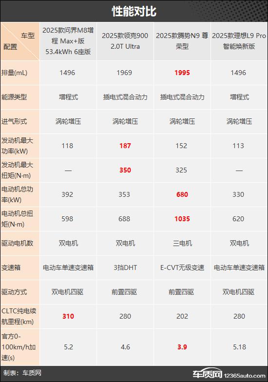 动力装置方面,问界 M9 和理想 L9 能源类型为增程式,领克 900 和腾势 N9 为了插电式混合动力,四款车的发动机进气方式都是涡轮增压,但是排量不同,领克 900 在发动机最大功率方面要优于其他三款车型。在电动机方面,采用三电机的腾势。 N9,电动机总功率和总扭距均优于其他三款车型。性能表现方面,腾势 N9 官方 0-100km/h 加快仅为 3.9s,比其他三款车型好。就许多消费者十分关注的纯电续航里程而言,问界 M8 表现更优,CLTC 达到纯电续航里程 310km,比四款车垫底的腾势更大。 N9 多出 108km 之多。