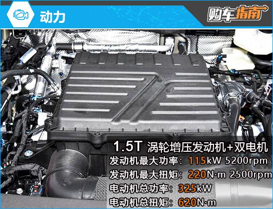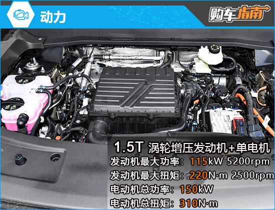 动力方面,新车搭载 1.5T 发动机,最大功率 最大扭矩115kW 220N · m。在电动机方面,两驱版配有单电动机,电动机总功率 电动机总扭距150kW 310N · m;四驱车型配有双电机,电机总功率 电动机总扭距325kW 620N · m。