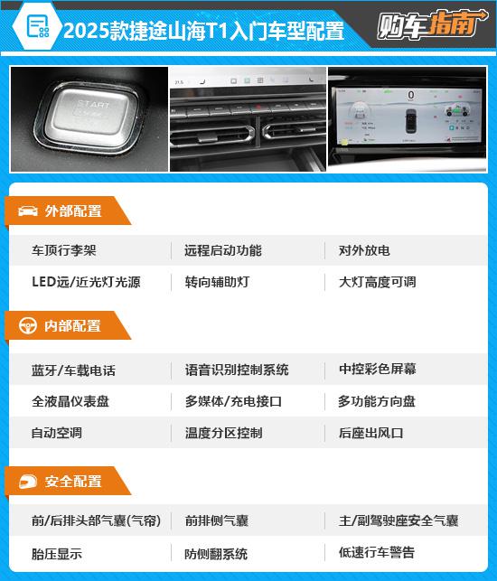 2025 款捷途山河 T1 入门级车型是 100km 高级,价格是 13.49 万元。尽管是入门级车型,但整体表现并不差,就像以前一样。 / 后排头部气囊 ( 气帘 ) 、基本的安全性、实用性配置,如远程启动功能、自动空调、多功能方向盘等。之所以不推荐入门级车型,主要是因为缺乏驾驶功能和主动安全配置。