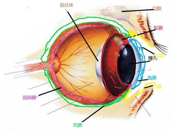 通常所说的眼白部分叫巩膜,巩膜表面覆盖着透明的球结膜。