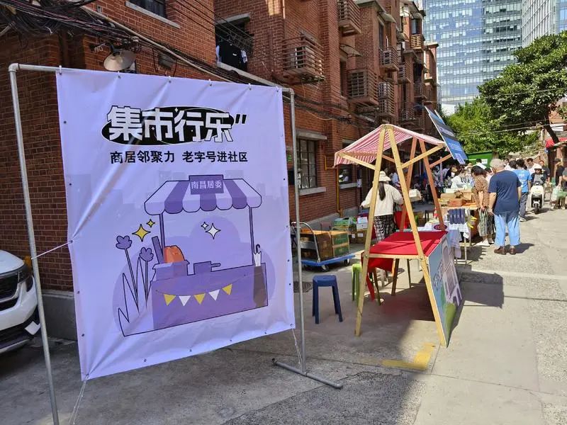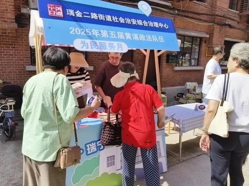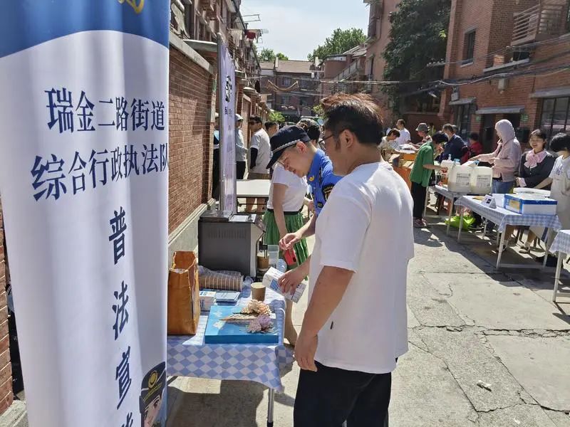 现场,除了丰富的老字号产品,拥有百年历史的星光摄影设备城,为居民提供废弃摄像头回收和免费摄像头清洁专业服务,帮助居民用镜头更好地记录更好的生活;淮海集团青年党员为居民提供一站式服务,如“潮步淮海”线上购物指导、保健茶试饮等。2025年,第五届黄浦政法队服务人民的月份也在淮海坊同时举行。瑞金二路街道社会治安综合治理中心和综合行政执法队为居民带来了普法宣传,引导居民共同守护社区、人身、财产的安全。南昌市居民区党总支和爱心企业为他们提供特殊的防暑降温饮料,以感谢老字号工作人员和政法队伍在高温下为社区居民服务。