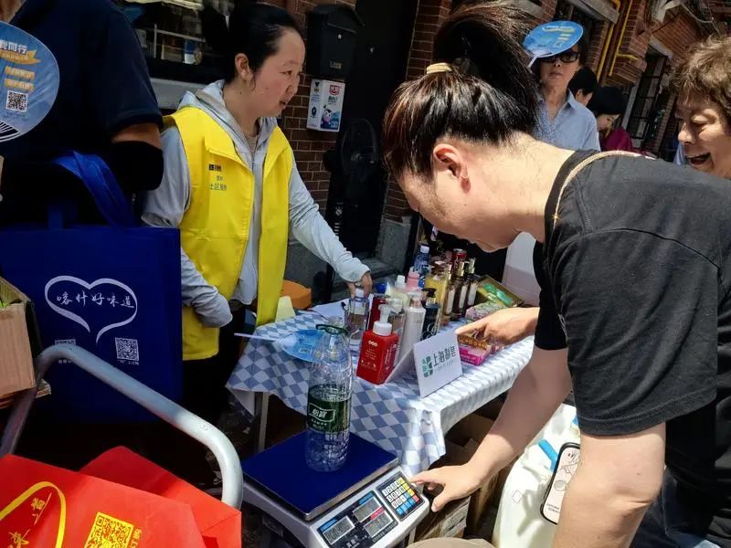 上海肥皂摊位被居民层层包围。许多居民带着容器来购买。虽然有些容器是轻微的塑料瓶,但工作人员还是把每一个容器放在电子秤里“去皮”,然后放入肥皂液。