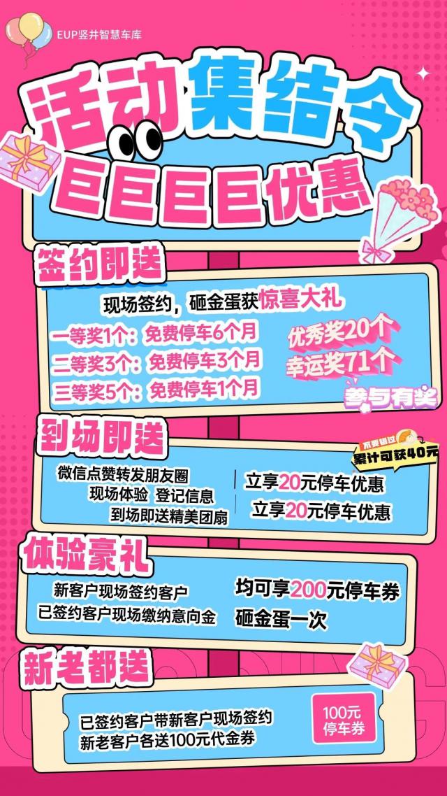 签约挑战砸大奖:现场签约的顾客,都可以通过砸金蛋获得奖励:一等奖: 1 名字(免费停车) 6 个月)、二等奖 3 名字(免费停车) 3 个月)、三等奖 5 名字(免费停车) 1 一个月),还有不同的停车券等着你赢。机会难得,不容错过!