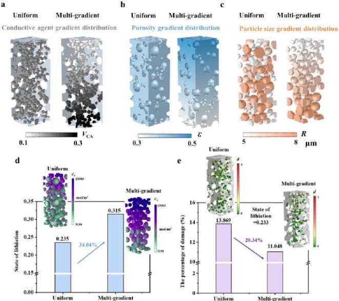 由于离子/电子传输的不对称性和厚电极显著增加的路径,电极内部有三个固有的梯度物理场:电解液中的锂离子通量、导电网中的电子通量和颗粒表面的反应通量(图1a)-b)。这一固有梯度物理场是造成厚电极快充和机械性能差的主要原因。研究小组提出了厚电极微结构的一般设计原理——匹配原理,将导电剂、孔隙率和粒径的梯度分布与这些固有的通量梯度一致,完成了多梯度匹配的电极微结构:从隔膜到集流体,导电剂的含量和粒度逐渐增加,孔隙率逐渐降低(图1c-d)。研究小组建立了锂离子电池的力-电-化全耦合模型,通过多物理场模拟验证了多梯度结构可以协同提高厚电极的快充性能和机械性能,提高34.04%的快充性能,同时减少20.34%的电极损伤(图2)。