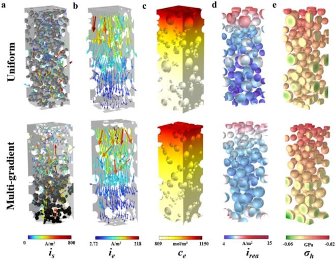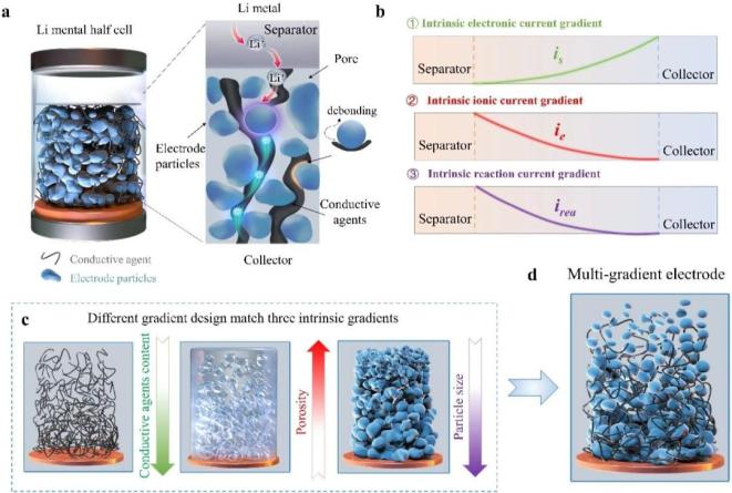 锂电池作为消费电子和电动汽车的核心动力储存部件,在碳中和过程中起着关键作用。为了满足电动汽车日益增长的续航里程和充电时间的需要,提高锂离子电池的能量密度、快充能力和循环寿命尤为重要。一种有前途的方法是开发具有增强电化学性能和机械稳定性的厚电极锂电池。然而,这一策略面临两大挑战:一是离子和电子传输距离增加导致反应动力学减少;第二,导电剂与电极颗粒之间的页面起层由于高充放电速度下的高锂化应力,加速了电池性能的下降。近日,材料科学家提出的梯度微结构设计方案为厚电极技术开辟了新的路径。通过建立电极内部的梯度结构,这种微结构设计有望同步提高电荷的高效传输和应力分布。目前的研究仍处于“试错式”探索阶段,因为梯度厚电极系统中离子/电子传输与反应的协同机制和应力演变规律的深刻认识不足。