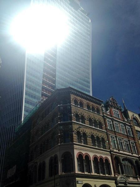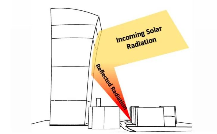 2013年夏末,当建筑还处于施工阶段时,一场意想不到的困境开始出现。8月底至9月初的几周内,由于天空中太阳的特定高度,朝南的巨大凹面玻璃幕墙开始起到聚集太阳光的作用 。