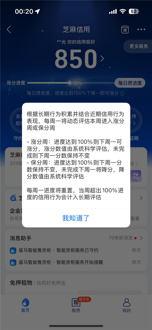 支付宝芝麻信用分大改版:每日积累进展 如果保分周未达到100%,将降低分数。