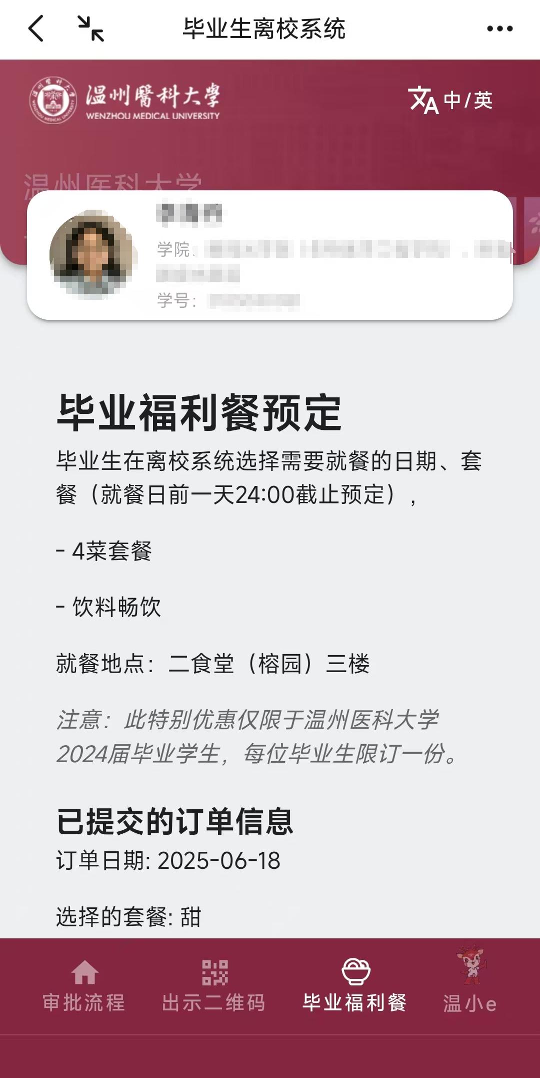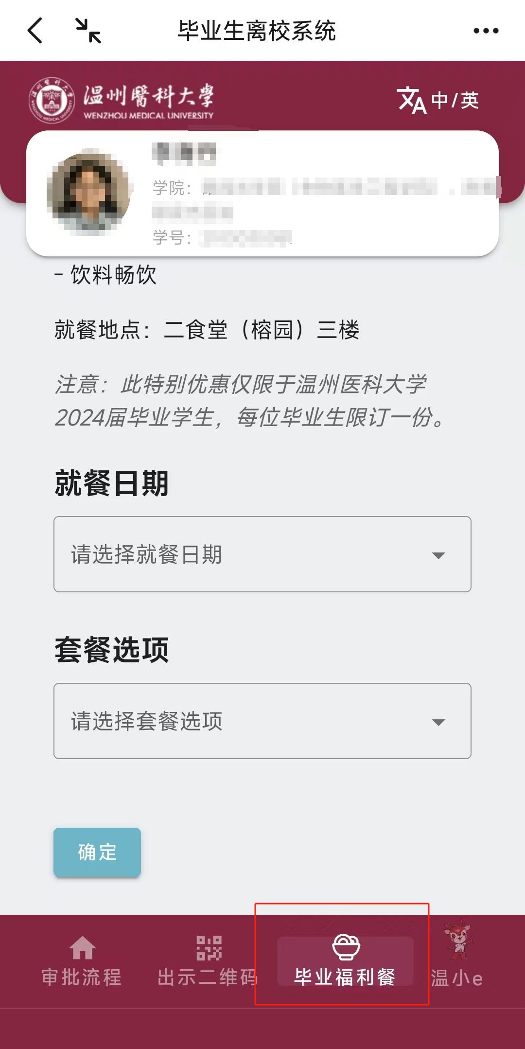 毕业生在离校系统中选择需要用餐的日期和套餐(用餐日前一天24:在预订之前,00截止),