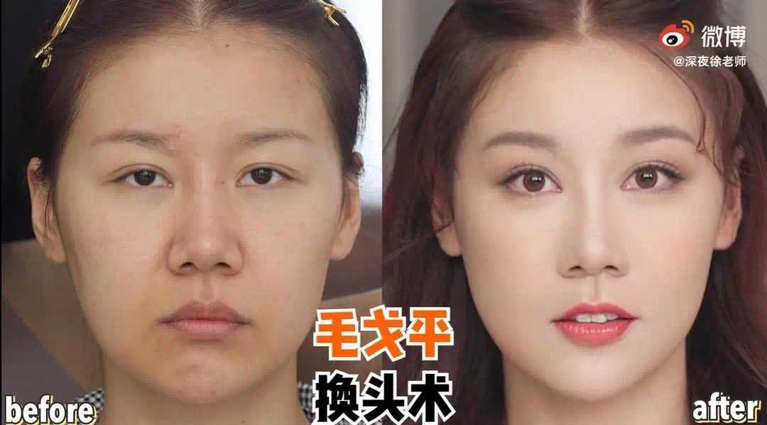 上图为深夜徐老师,下图为毛戈平为李佳琦助播Seeya化的“刘亦菲仿妆”
