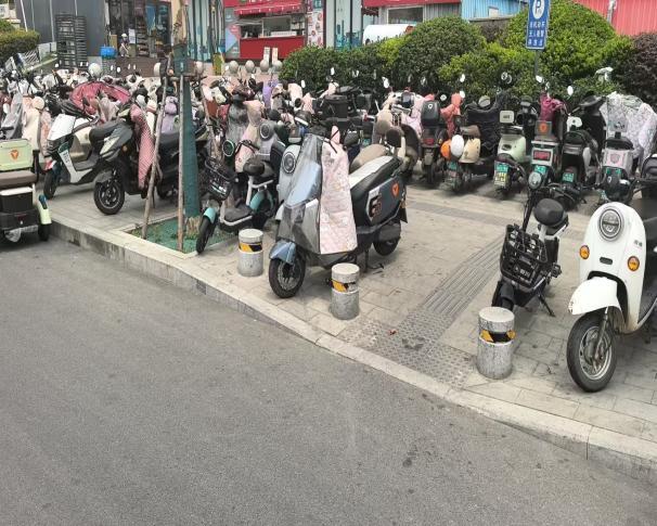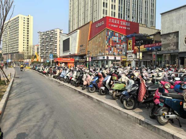 商场南门区新规划的非机动车停车区,瑶海区万达广场,一辆电动自行车按顺序停放,井然有序。