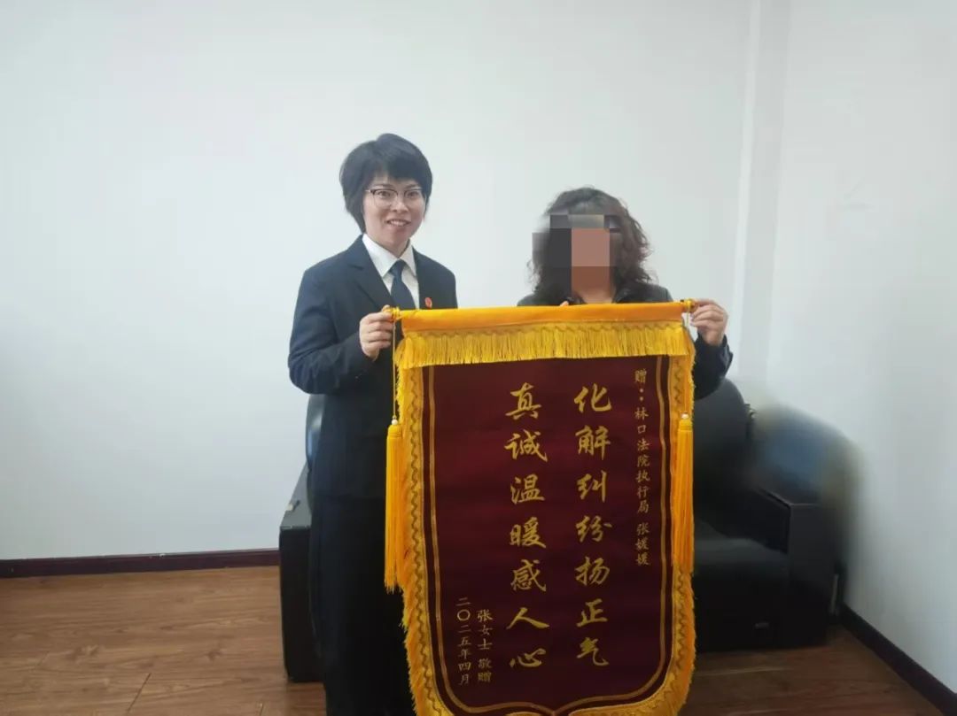 申请人张某在执行法官的横幅上写道:“解决温暖纠纷,真情温暖感人”。