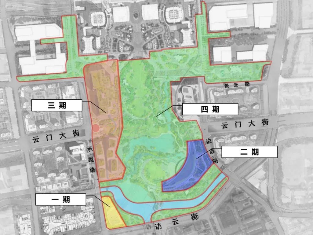 四期工程“中央绿谷”项目作为云门公园的主体部分,总用地面积约24公亩,规划设置综合慢行交通网络、环水系统、大型草原等多种功能场景。站南生态文化服务中心和交通换乘枢纽四期(市政部分)I标段项目是“中央绿谷”的重要组成部分,用地面积约124572平方米,涉及一座大型人行桥,两座人行景观桥,最大单跨33米,长约329米,长约441米。主要建设内容包括公园配套服务设施、文化广场、大型多功能运动场、河道整治工程、架空走廊、游船码头、非机动车道、社会公共停车场等。