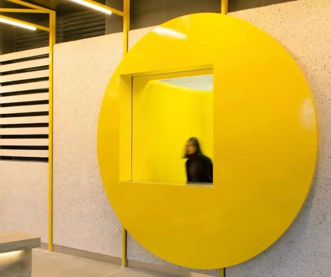 比如第一家店和798艺术区的第二家店,在大规模明亮的黄色圆形背景下嵌入矩形窗口,看起来很时尚;凤凰汇三店采用黄灰色竖条格栅组合长方形小窗,简约又有设计感。