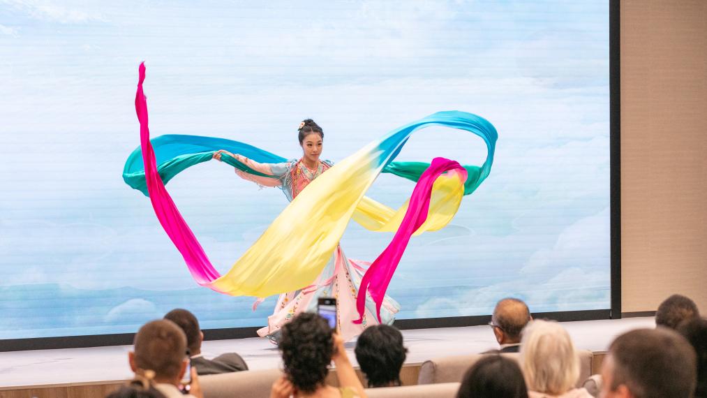 u2003u20036月16日,来自广州粤剧院的表演者在塞尔维亚首都贝尔格莱德中国文化中心展示了长丝舞。新华社(王?)