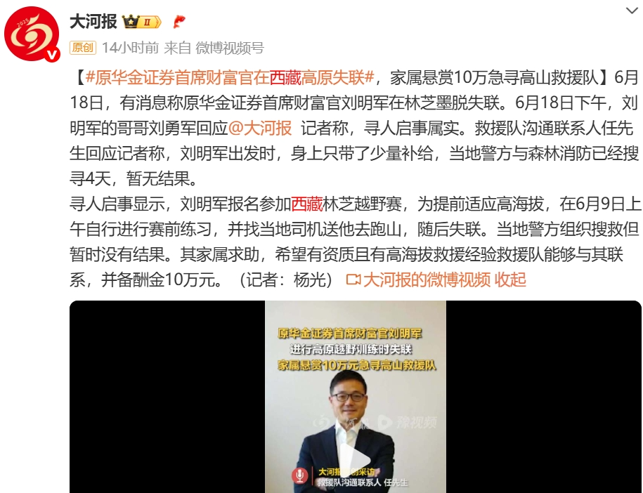 在过去的两天里,业界传出一条消息:50岁的原华金证券首席财富官刘明军,在西藏林芝跑山失联,家人悬赏10万找人。