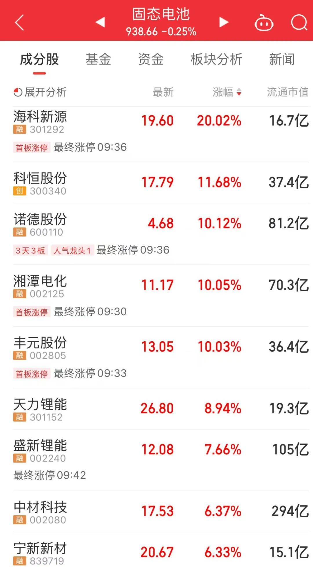 今日上午,固态电池板块大幅上涨,海科新源等股票大幅上涨。