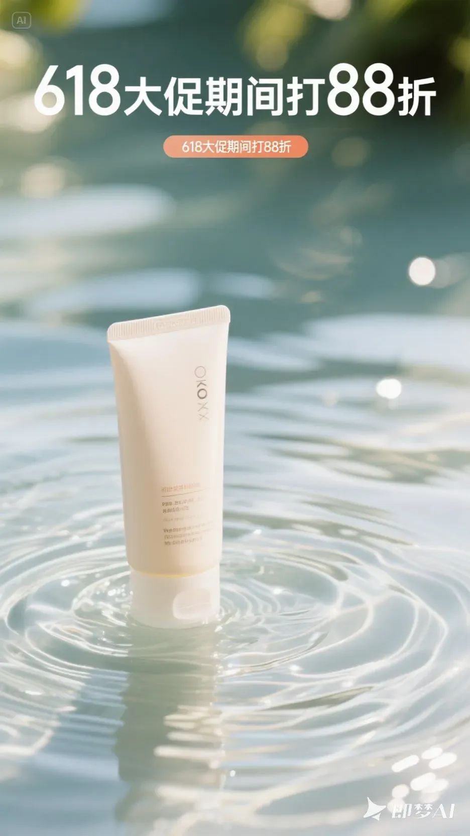 导出照片符合内容上的输入指令,但仍存在一些缺陷。比如洁面乳瓶上不小心印了“618促销”这个词作为产品名称,画面左下方出现了无意义的错码,但整体效果是无法掩盖的。
