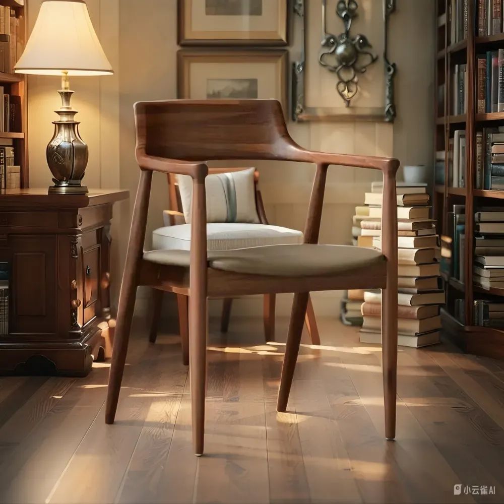 整体导出照片与输入指令一致,椅边无毛刺,光线柔和,光影自然,同时书柜、书籍、台灯等条件也呈现出来。