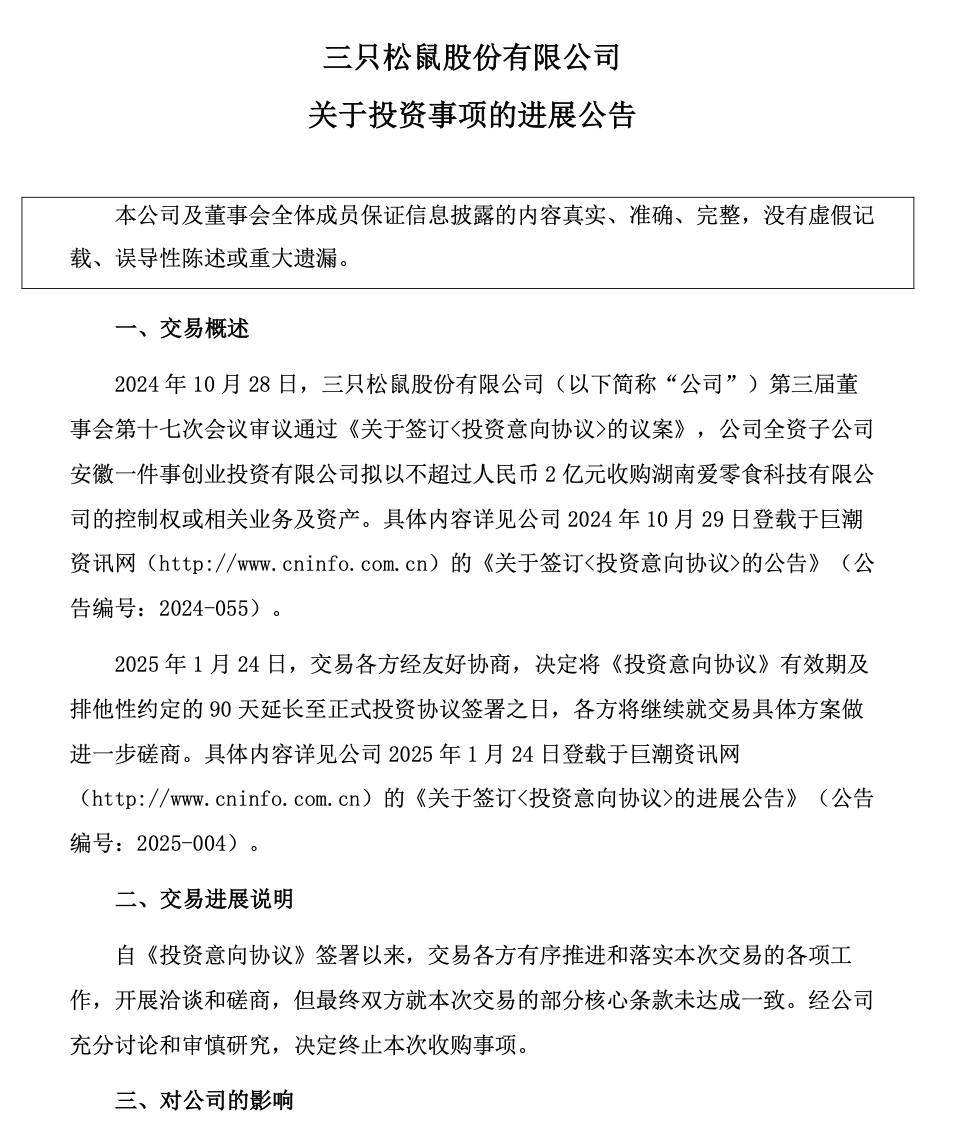 6月16日,三只松鼠宣布,公司全资子公司安徽一事风险投资有限公司计划以不超过2亿元的价格收购湖南爱零食科技有限公司的控制权及相关业务和资产。2025年1月24日,交易各方决定将《投资意向协议》的有效期和唯一性约定的90天延长至正式投资协议签署之日。但是,自《投资意向协议》签署以来,由于部分核心条款没有达成一致,交易各方最终决定终止此次收购。