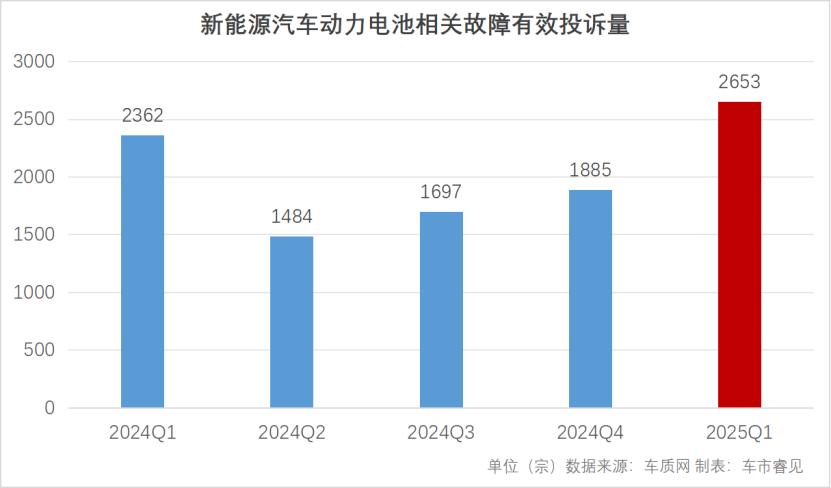 根据汽车质量网发布的2025年第一季度新能源汽车电池系统投诉分析,汽车质量网收到新能源汽车动力电池相关故障有效车主投诉信息2,653个,环比增长40.7%,同比增长12.3%,创造了单季度投诉数量的最高记录。