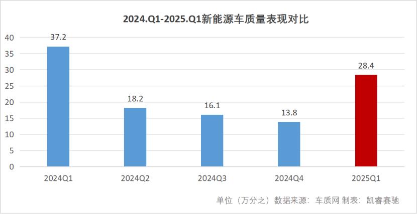 投诉销售比例是汽车质量网在一定时期内衡量商品质量表现的指标,数值与质量表现成反比。该值从2024年第二季度开始持续下降,2024年第四季度降至过去一年的最低点。质量表现呈现出持续进步的趋势,但第一季度数据突然上升,反映出新能源汽车在这一时期的质量不容乐观。