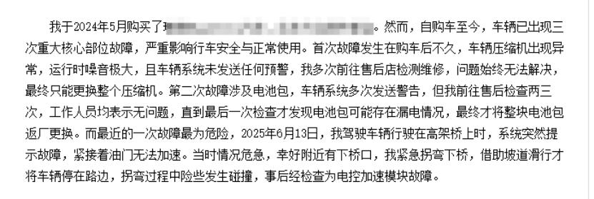 在汽车质量网上,有消费者表示,他们购买的车辆自动选择N挡,在没有高速冲击等问题的情况下振动,造成重大隐患;也有客户对汽车续航提出异议,其车辆标称续航600公里,实际上只能行驶300公里。 km,与标称续航有很大不同;也有客户经历过各种各样的问题,包括车辆不能加速。