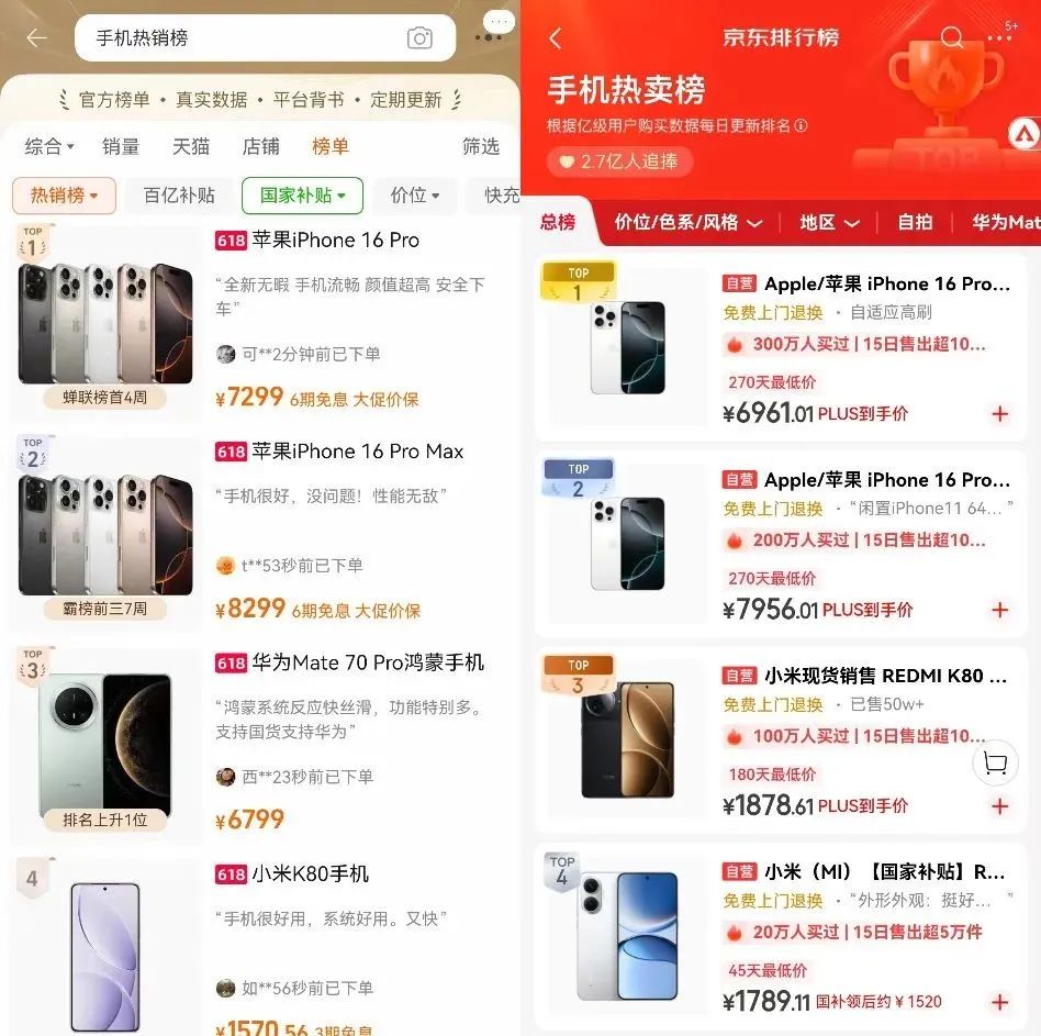 618落下帷幕,iPhone 16 Pro和iPhone 16 Pro Max在JD.COM和天猫手机热卖榜上获得亚军。