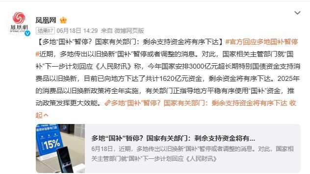 截至 6 月中旬,1 月和 4 每个月已经分成两批下发 1620 支持地方做好一、二季度消费品新旧置换工作;剩下的 1380 下半年将分批有序拨付1亿元,同时地方政府将按比例配套,自行安排足够的地方资金,“国补”将继续造福消费者。