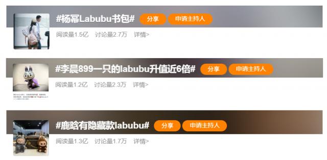 这款毛绒玩具已经成为明星们的曝光工具,明星 Labubu 词条,基本上都是过万的讨论量,过亿的阅读量。