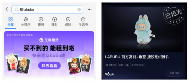 点击支付宝,可以直接在芝麻租赁中租用。 Labubu ,现在最火的 3 代大概 6 元钱一天。
