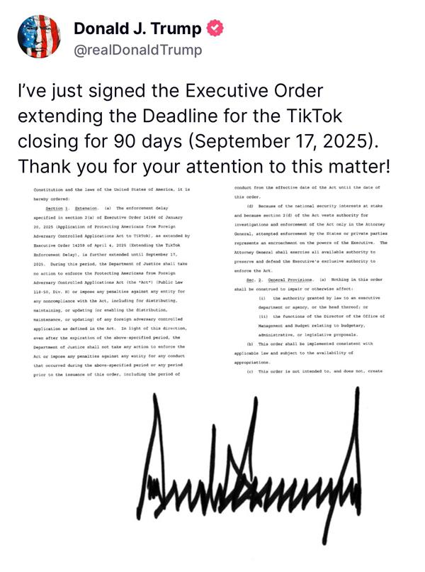 快科技 6 月 20 日前,美国总统特朗普签署了行政命令,并将再次签署行政命令。 TikTok 美国的禁令期限增加了 90 天空,新的截止日期是 2025 年 9 月 17 日。