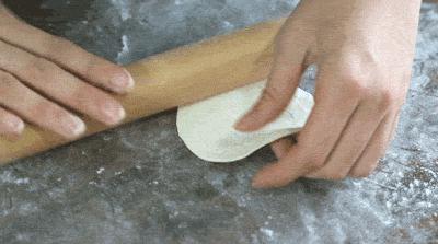 4. 将饺子皮转圈擀成圆形,上下推均匀用力。