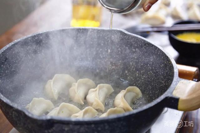 2. 锅内围着饺子均匀地倒入一圈开水,盖上盖子炖。 3 分钟。
