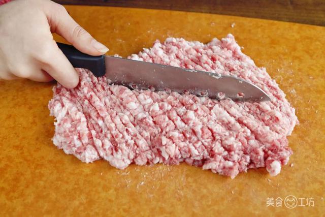 2. 将猪肉剁成肉馅,蒜姜剁碎备用。